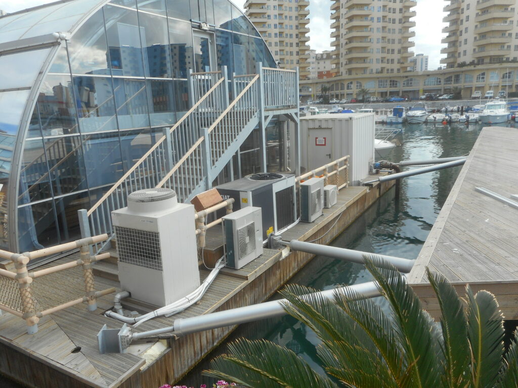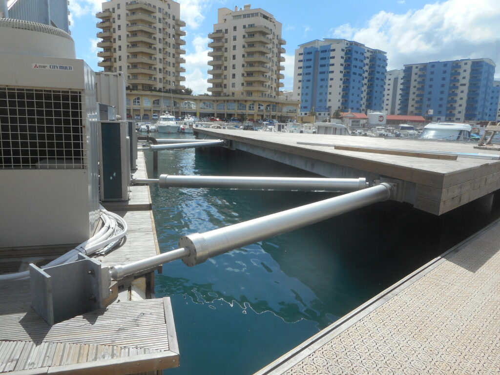 The highly damped DualDocker system keeps floating structures like this office in Gibraltar securely moored and without play regardless of the water level.